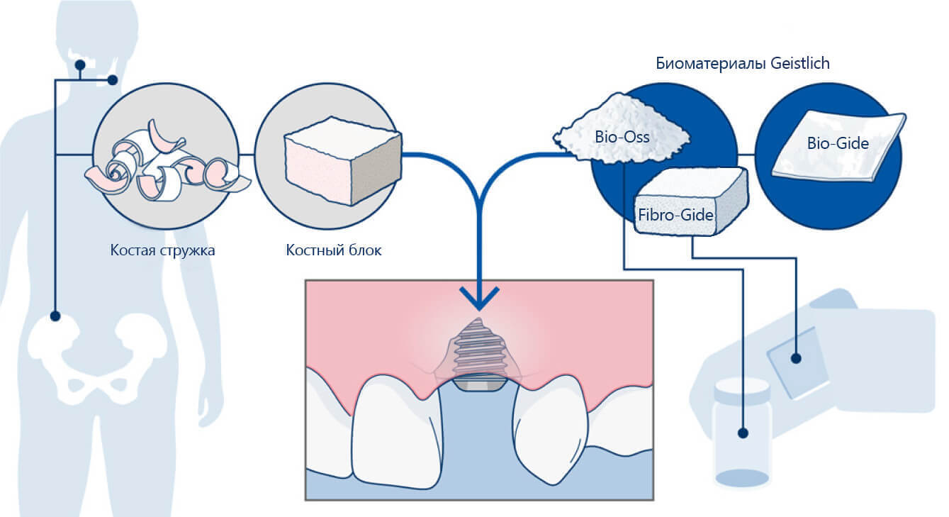 Для установки имплантата важно обеспечить достаточное количество костной ткани. Там, где наблюдается недостаток высоты или ширины кости, с помощью биоматериалов создается новая костная ткань. Материалы из коробки можно использовать как самостоятельно, так и в сочетании с аутокостью.